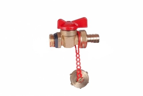 Vypouštěcí kulový kohout s integrovaným těsněním, s hadicovou vývodkou a zátkou, krátká páčka.