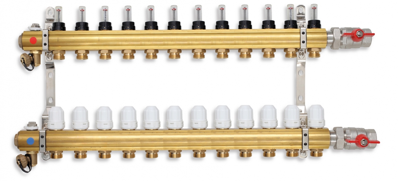 Rozdělovač RZP12 s termostatickými ventily a reg. šroubením s průtokoměry.